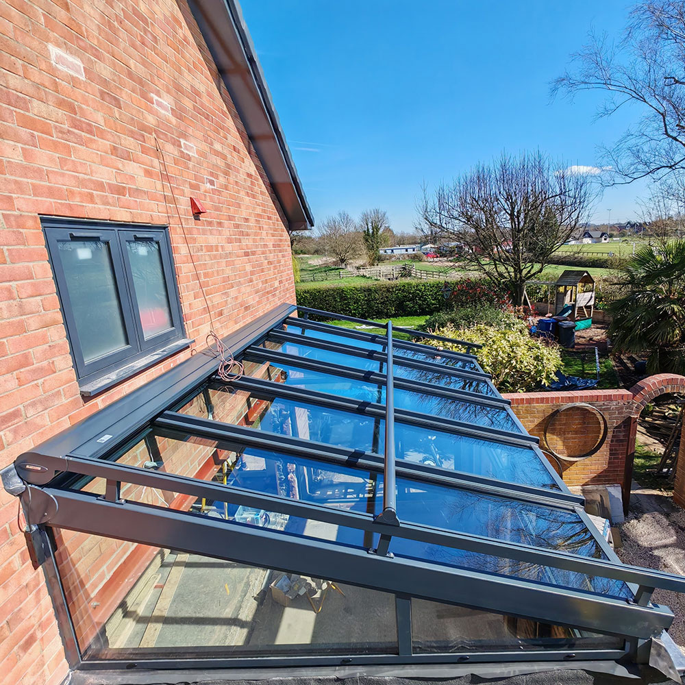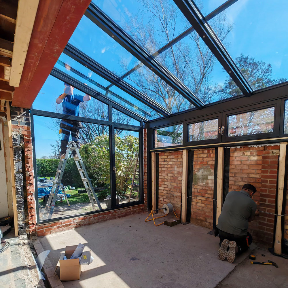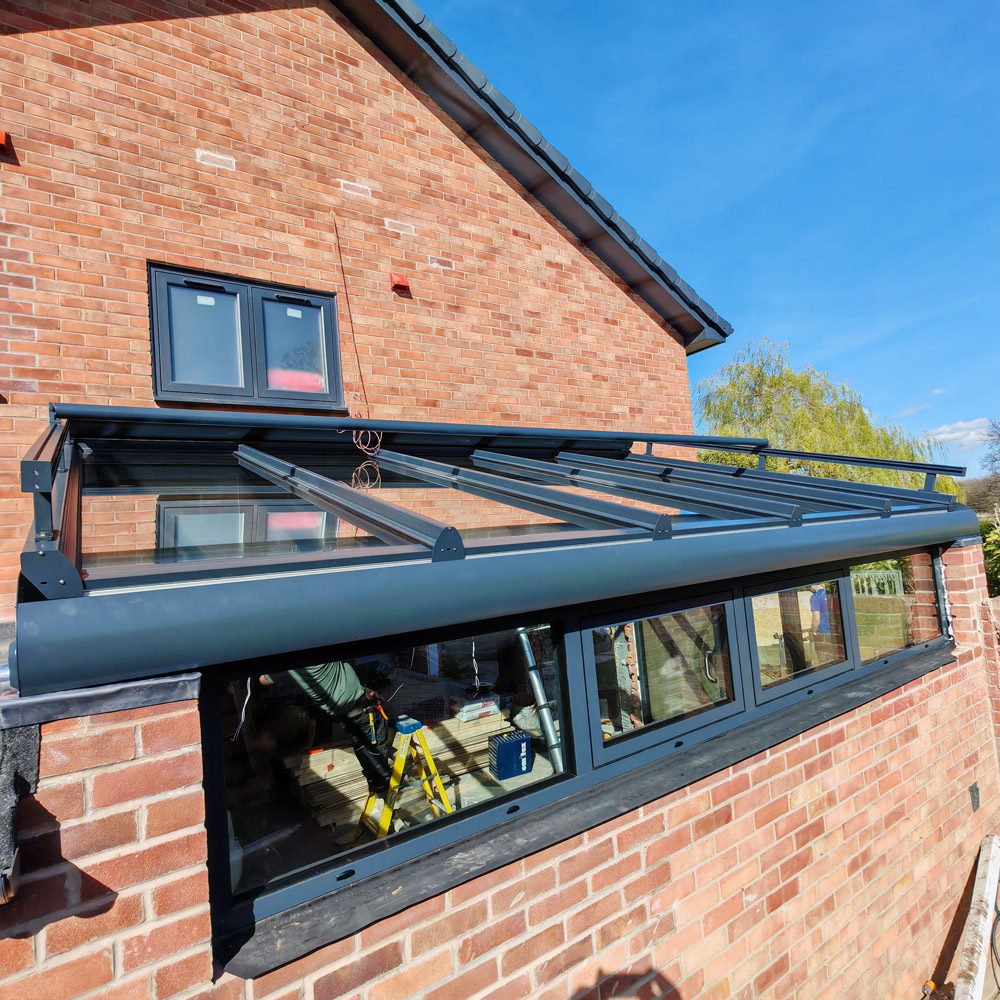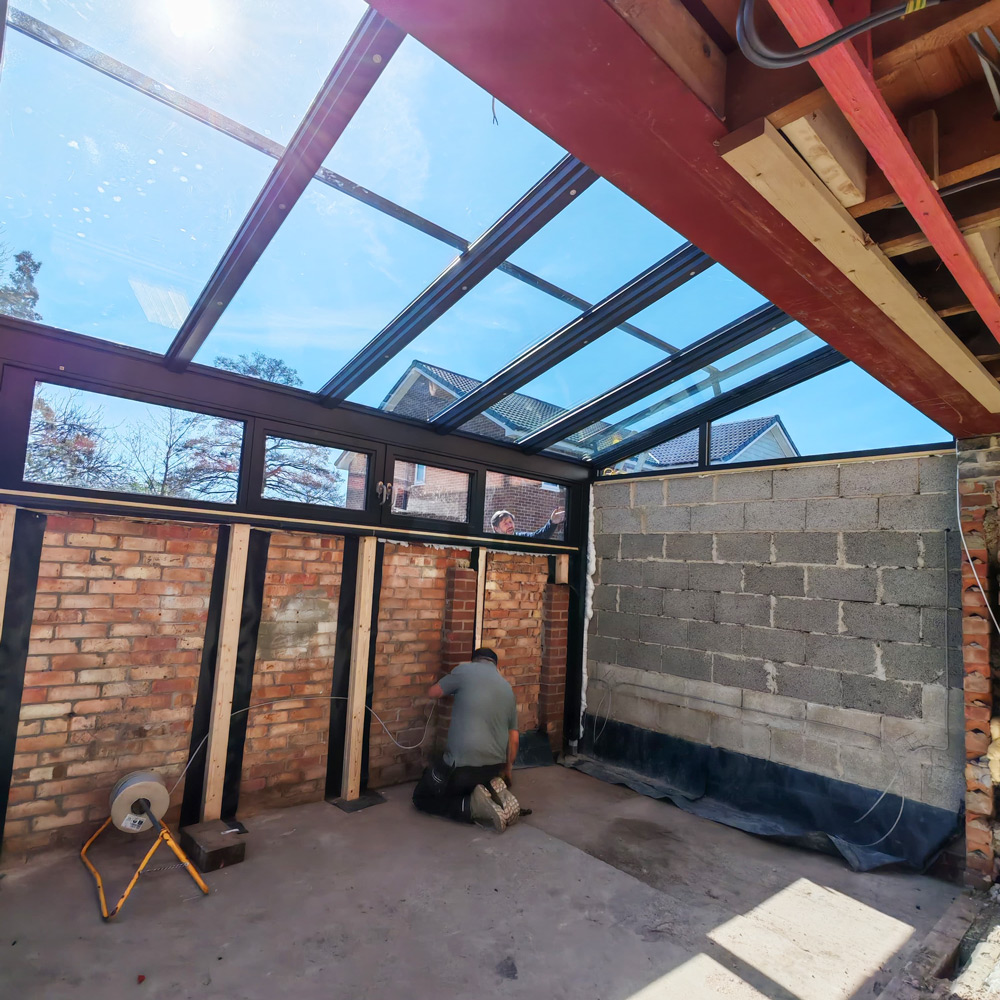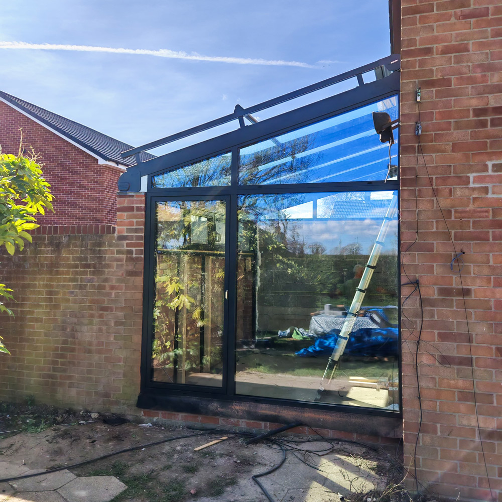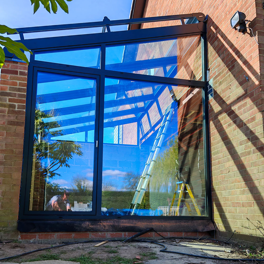 The clients were renovating their home and wanted to increase the living space by converting the rear of the garage. Rather than going down the traditional tiled route, they saw how a glass extension could enhance the space after seeing the glass extensions page on our website. They were concerned about heatloss in winter but their fears were allayed after visting our showroom and doing further research. They were also concerned about over-heating in summer and opted for the external powered awning. The awning prvides shade and unlike internal blinds, it prevents the rays of the sun from hitting the glass at all. They also added a couple of side windows for ventilation. They have been delighted with their new living space!